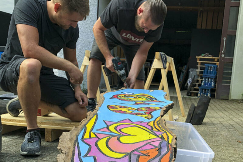Zunächst wurden zwei Meter lange Holzstelen zurechtgesägt, die den Korpus des »Big Sliding Space Ship«, eines kunstvollen Raumschiffs, bilden sollten. Im Anschluss kamen Bunsenbrenner und Farbe zum Einsatz – es wurde bunt und flammenreich. Viele der bereits im Vorfeld auf Papier gemalten Kunstwerke fanden auf den Stelen wieder einen Platz. Der Technische Dienst der Region Süd half dabei, die vielen einzelnen Elemente zusammenzufügen, und dann stand das gigantische »Big Sliding Space Ship« zum ersten Mal in voller Pracht da. Paul Berno Zwosta beschreibt es mit folgenden Worten: »Entstanden ist ein dreidimensionales Kunstwerk –