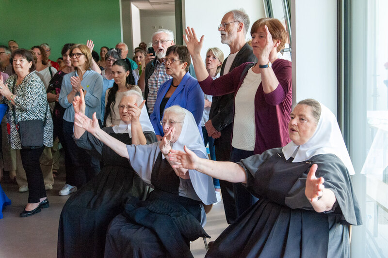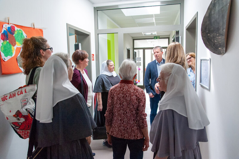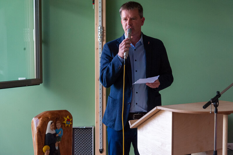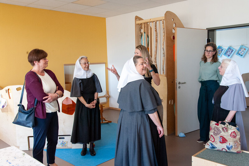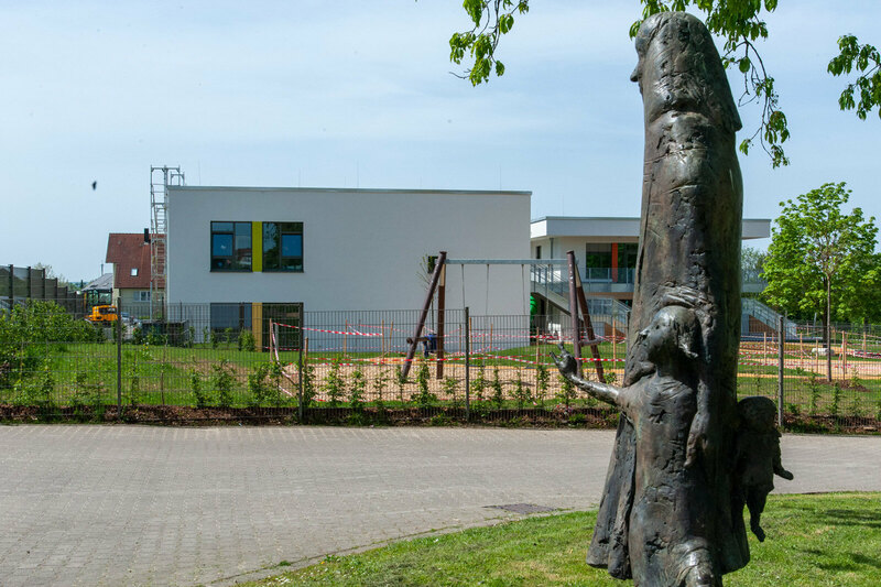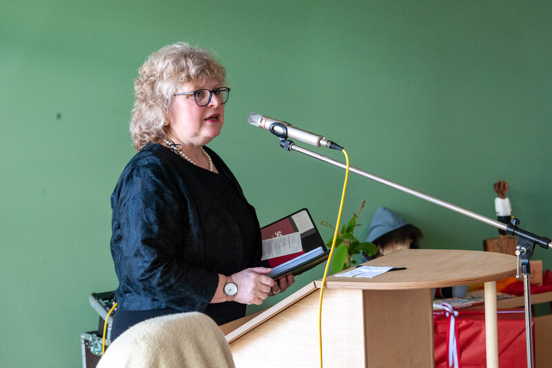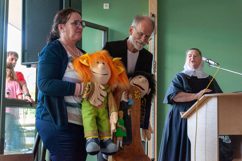 „Besser hätte es nicht laufen können“, so fiel das Resümee von Oberbürgermeister Thilo Michler aus, der in seinem Grußwort auch noch einmal den Werdegang des Bauprojekts skizzierte – vom einstimmigen Ratsbeschluss am 23. Februar 2021, über den ersten Spatenstich am 29. Oktober 2021, bis zum Richtfest am 4. Juli 2022. Seit vielen Jahren werde schon an der Umsetzung des Bedarfsplans gearbeitet. Daher sei es für ihn eine große Freude gewesen, dass der Friedenshort ein offenes Ohr für den Wunsch der Stadt Öhringen gehabt habe, Bau und Trägerschaft für eine neue Kita zu realisieren. Dass es eine leichte Verzögerung gegeben habe, sei nicht unüblich bei einem solchen Projekt und letztlich auch nicht tragisch. „Also die Kinder sehen auf jeden Fall glücklich aus, das spricht für das tolle Team“, befand Thilo Michler. Mit Blick auf Nachhaltigkeitsaspekte freue es ihn zudem, dass die Kita und das gesamte Friedenshort-Gelände über das Nahwärmenetz der Stadt Öhringen und das neue Hackschnitzelwerk versorgt werden könne. Über die beiden großen mitgebrachten Geschenkekartons freuten sich dagegen besonders die Kinder. Zukünftig kann mit zwei schmucken Bobbycars über die Flure geflitzt werden. Regionalleiter Jürgen Grajer dankte für die gute Kooperation sowie den zahlreichen Gästen für ihr Kommen. „Unsere Zielgruppe haben wir auf jeden Fall deutlich verjüngt“, meinte Grajer mit Blick auf die über 100 Kinder, die zukünftig in der neuen Kita Platz finden. Oberin Sr. Christine Killies hob hervor, dass die Schwesternschaft das Projekt sehr aufmerksam begleitet hätte. Mit Blick auf den Namen der Kita hatte sie als Geschenk eine Skulptur der Namensgeberin mitgebracht: Friedenshort-Gründerin Eva von Tiele-Winckler hat diesen Namen bereits vor über 130 Jahren für das allererste Haus geprägt, in dem ihre sozial-diakonische Arbeit begann.