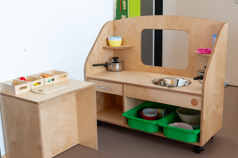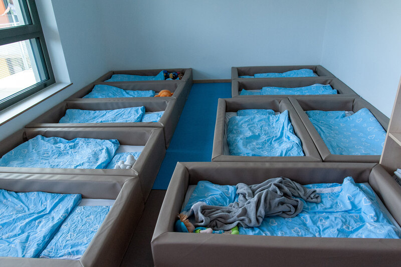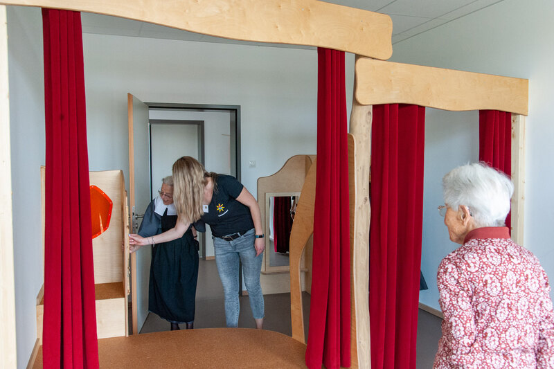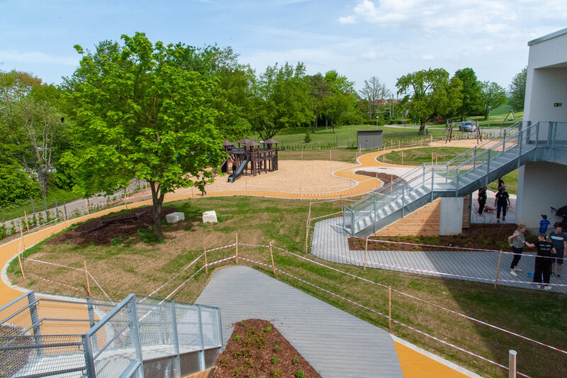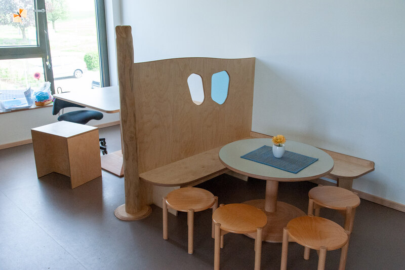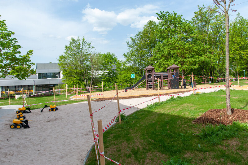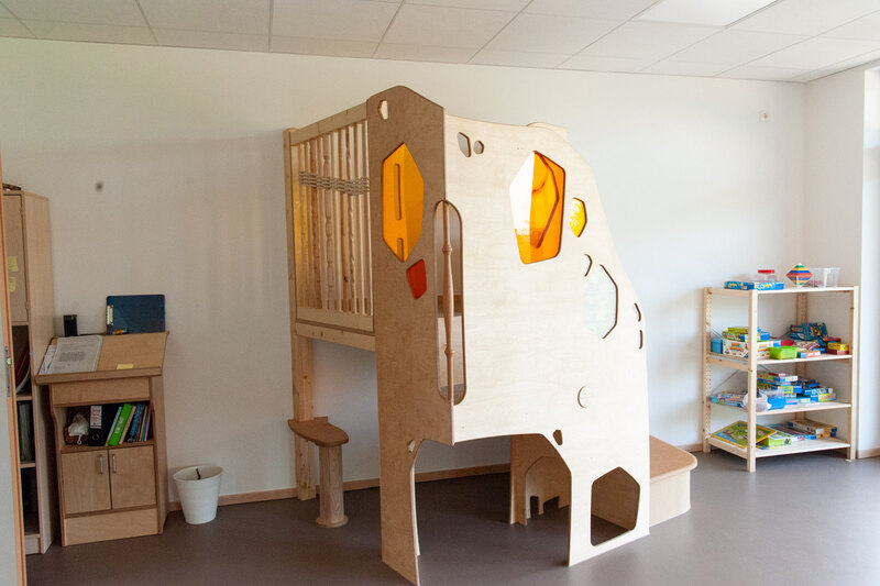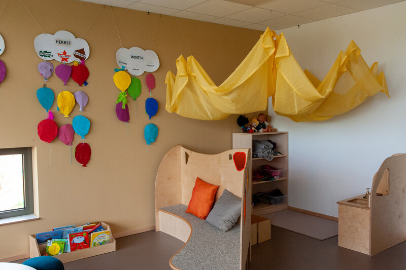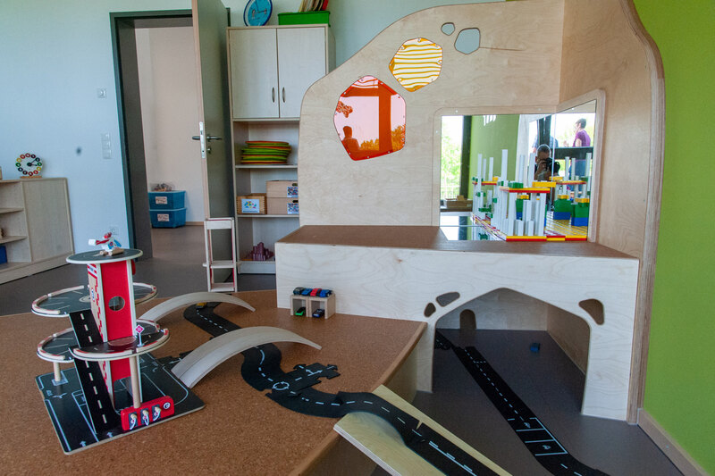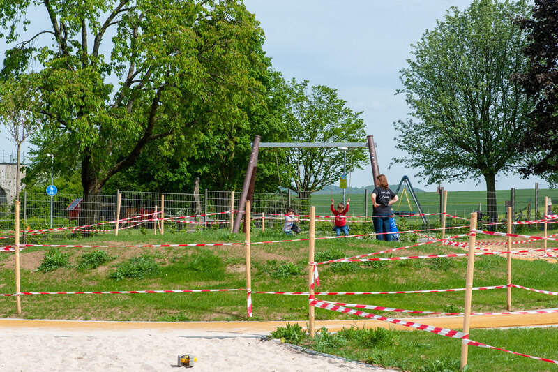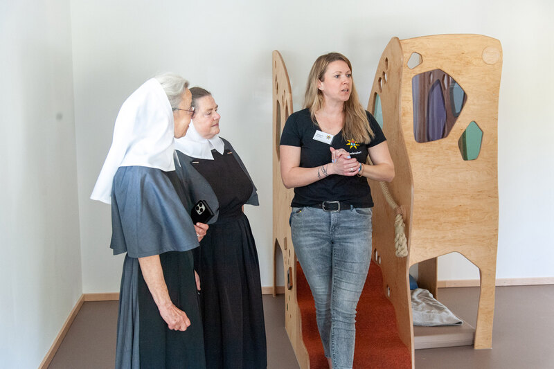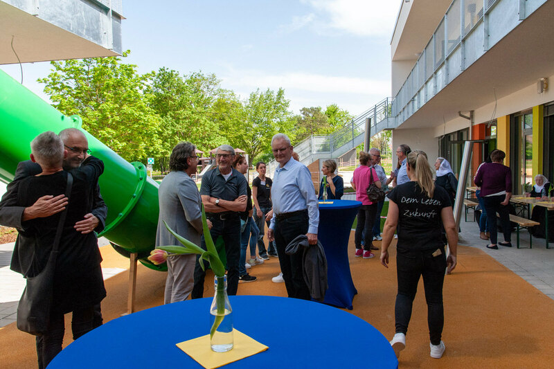 Nach dem Auftakt war Gelegenheit, sich mit kühlen Getränken (nachmittags war die 30-Grad-Marke erreicht) und Häppchen zu versorgen sowie an geführten Rundgängen durch die Gruppenräume teilzunehmen. Vorgesehen ist die Kita als integratives Projekt für sieben Gruppen, davon zwei Schulkindergartengruppen in Kooperation mit der Tiele-Winckler-Schule und zwei Krippengruppen. Die Gruppennamen basieren auf verschiedenen Edelsteinen, deren Farbgebung sich in den Räumen widerspiegelt. Holz und Kork dominieren bei den unterschiedlichen Spielmöglichkeiten zum Klettern und Entdecken. Ein Rollenspielraum mit kleiner Theaterbühne und Vorhang wird sicherlich auch zu einem beliebten Platz werden. Zum Klettern, Spielen und Toben lädt auch das großzügige Außengelände ein. Hier war der Vorteil, mit dem Cappelrain ein vorhandenes Wiesengelände dazu sehr gut nutzen zu können. Alles ist komplett eingezäunt, so dass kein Kind aus Versehen „verloren“ gehen kann. Nach und nach werden sich nun die Räume füllen. Die ersten Kinder sind bereits im März eingezogen aus der Kita „An der Lehmgrube“, die von der Evangelischen Jugendhilfe Friedenshort als Interimslösung ab Oktober 2022 von einem anderen Träger übernommen worden war.