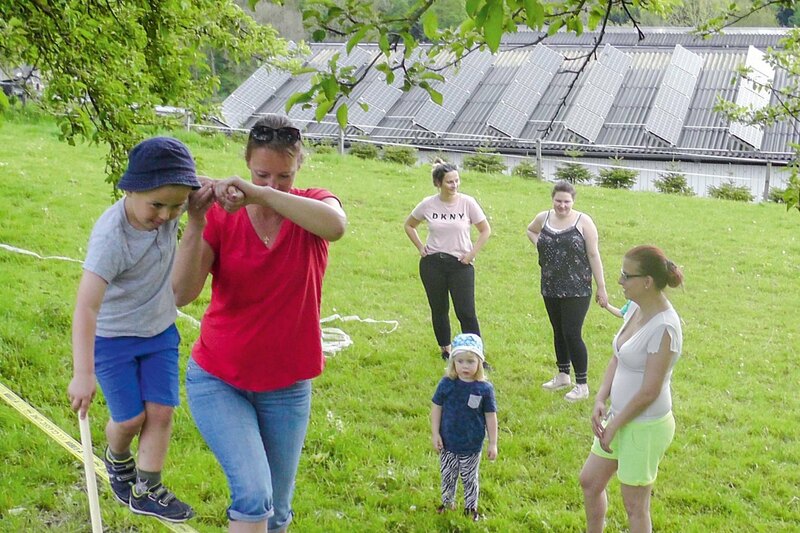 Dann ging es weiter zu einer Schlucht, die jeder überwinden musste, indem er über ein Seil balanciert. Als Hilfe hatten wir einen Stock, auf den wir uns abstützen konnten. Zuletzt mussten wir um einen gefährlichen Vulkan gehen. Dafür mussten die Kinder über ein Seil gehen, das von den Erwachsenen straff im Kreis gehalten wurde. Dann endlich hatten wir „Buhn, das Huhn“ gerettet!“
