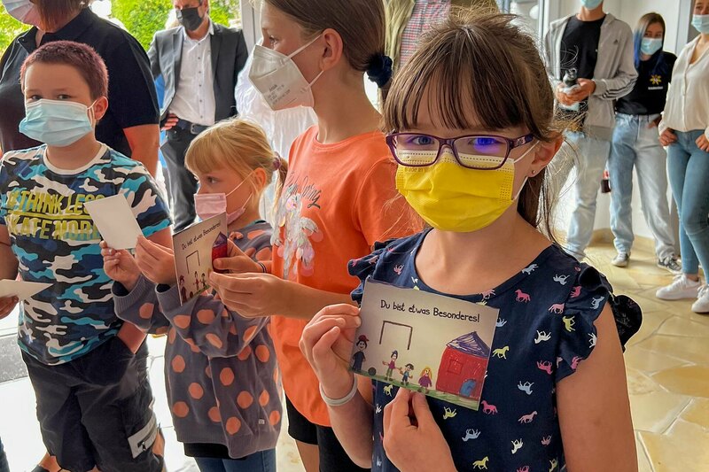Kurz bevor Frau Louis das mit dem Anlass verbundene Sommerfest der SGA-Flex für eröffnet erklärte, gab es für die Kinder seitens der Geschäftsführung noch ein Geschenk für die Gruppe und eine besondere Karte, die Pfrn. Riegas-Chaikowski an jedes Kind und jeden Mitarbeitenden überreicht. „Du bist etwas Besonderes!“ steht über einer Kinderzeichnung geschrieben. Dies war und wird auch zukünftig die Botschaft sein, die die Mitarbeitenden der SGA-Flex den Kindern immer wieder vermitteln.