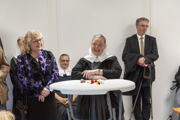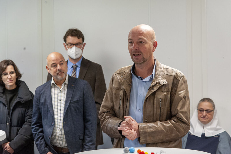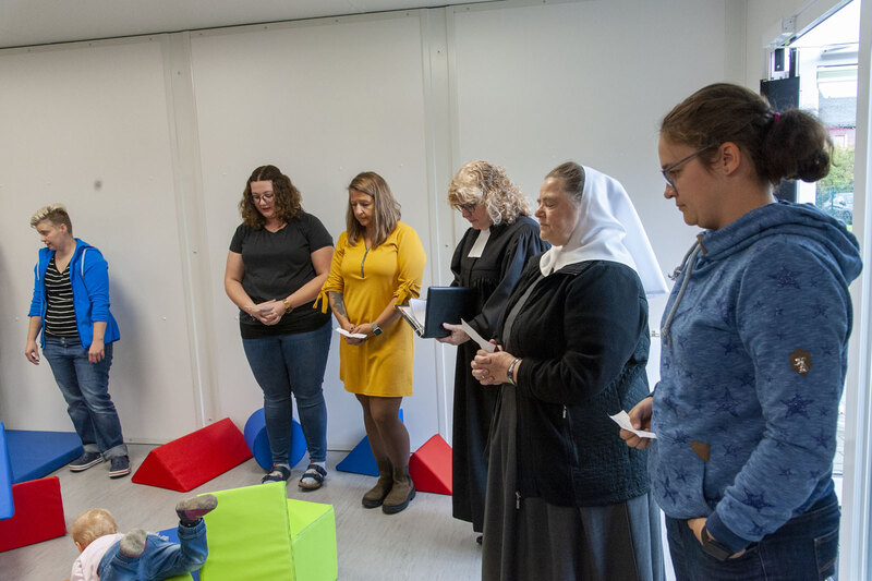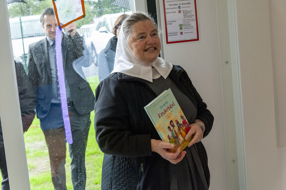 Das besondere Engagement des Mitarbeitenden-Teams hob Thorsten Entrop, Regionalleiter West der Evangelischen Jugendhilfe Friedenshort, in seinem Gruß besonders hervor: „Sie haben in kürzester Zeit leere Container in eine kindgerechte Kita verwandelt!“ Natürlich fehle hier und da noch etwas, aber jeden Tag werde die Kita noch ein bisschen bunter. „Es ist nicht selbstverständlich, dass diese Übergangslösung der Kita in so kurzer Zeit realisiert werden konnte“, dankte Ralf Pohlmann, Sachgebietsleiter im Jugendamt des Kreises Siegen-Wittgenstein, allen Beteiligten. Dies gelte vor allem mit Blick auf die momentane Beschaffungssituation für viele Materialien. „Ich wünsche der Kita einen ganz tollen Start“, so Olaf Smolny, Amtsleiter für Jugend, Sport und Soziales der Stadt Freudenberg. Es sei schön, mit dem Friedenshort nun einen weiteren Kindergartenträger im Stadtgebiet zu haben, dies empfinde er als Bereicherung. Für die Schwesternschaft wünschte Oberin Sr. Christine Killies dem „Friedensnest“ Gottes Geleit, und dass alle Kinder gut und behütet dort aufwachsen mögen. Das Schlusswort gehörte dem Kita-Team aus Erzieherinnen, einer FSJlerin und derzeit zwei Praktikantinnen und Praktikanten. „Für uns war das auch enorm spannend, alles von Anfang an mit vorzubereiten, und wir haben uns sehr schnell toll zusammengefunden“, befand Verena Schneider. Genauso spannend sei es natürlich für die Eltern gewesen, weil ja eine Anmeldung zu einer Kita erfolgte, die es zu dem Zeitpunkt noch gar nicht gab: „Wir danken daher ganz herzlich für den Vertrauensvorschuss!“