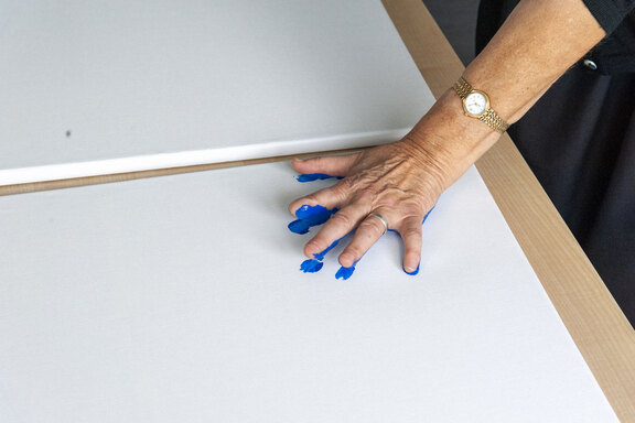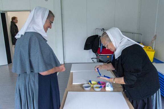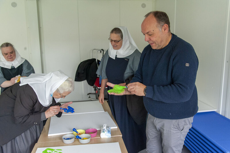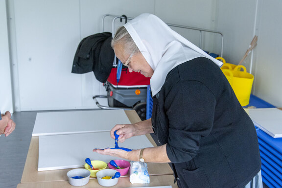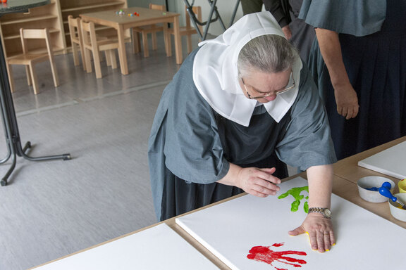 Und die Kita-Kinder hatte Pfrn. Riegas-Chaikowski auch besonders im Blick, als es fröhlich und wuselig darum ging, aus bunten großen Stoffbausteinen eine Kita zu bauen – ein Symbol für die Zukunft. Denn aus dem jetzigen Behelf soll einmal ein richtiges Gebäude werden. Die Anfrage an den Friedenshort war nämlich „nicht aus der Luft gegriffen“, sondern fußte auf der Konzeption des momentan im Bau befindlichen Projekts „Wohnen und Pflege am Wald“ in unmittelbarer Nachbarschaft. Darin war für die weitere Zukunft im Anschluss an die Fertigstellung eine Kita vorgesehen, vornehmlich - aber nicht nur - für Kinder von Mitarbeitenden. Die erwachsenen Gäste und die Kita-Kinder waren außerdem aufgefordert, auf bereitgestellten Leinwänden ihren farbigen Handabdruck zu hinterlassen. „Wir wollen damit nicht nur unser Miteinander zeigen, sondern dürfen auch die Gewissheit haben, dass es Gottes Hände sind, die uns gemeinsam tragen“, betonte Pfrn. Riegas-Chaikowski.