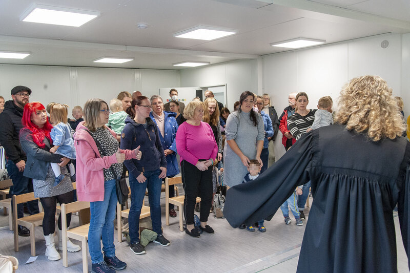 Freudenberg. „Einfach spitze, dass du da bist“ erklang am 28. September aus vielen Kehlen ganz junger und auch etwas älterer Menschen als gemeinsames Lied zur kleinen Eröffnungsfeier der Kita „Friedensnest“ der Evangelischen Jugendhilfe Friedenshort in Freudenberg. Tatsächlich da sein zu können – eine Selbstverständlichkeit war das nicht. „Ganz viele fleißige Hände haben das möglich gemacht, dass wir heute hier feiern können“, betonte Leitende Theologin Ute Riegas-Chaikowski in ihrer Begrüßung von Kindern, Eltern, Mitarbeitenden, der Delegation der Friedenshort-Schwesternschaft sowie Gästen aus den Verwaltungen von Stadt Freudenberg und Kreis. Denn zwischen der dringlichen Anfrage von Kreis Siegen-Wittgenstein und Stadt Freudenberg, ob Kinderbetreuungsplätze im U3-Bereich geschaffen werden können, und dem gewünschten Start zum Kita-Jahr am 1. August 2022 lag nur ein gutes halbes Jahr. Das geflügelte Wort „aus dem Boden gestampft“ ist da nicht unpassend. In kürzester Zeit wurde eine Fläche hergerichtet auf dem ehemaligen Sportplatz gegenüber dem Klinikum Bethesda, der sich im Besitz des Friedenshortes befindet. Für die Beschaffung von Miet-Containern, Möblierung, Ausstattung mit Spielgeräten und vor allem das Zusammenstellen des Teams der Erzieherinnen und Erzieher war der zur Verfügung stehende Zeitplan nicht weniger ambitioniert. Zwanzig Kinder im U3-Alter beherbergt nun das „Friedensnest“, eine Abwandlung des Trägernamens Friedenshort mit Blick auf die ganz jungen Menschen.