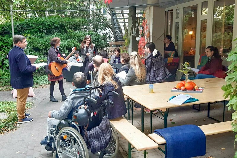 Außerdem gab es zwei Jubiläumsfeiernachmittage am 24. und 25. September mit den Angehörigen und gesetzlichen Betreuerinnen und Betreuern jeweils separat für jede Wohngruppe. Dabei erinnerte Regionalleiter Norbert Rodermond in seinem Rückblick an verschiedene Geschehnisse und Veränderungen in den letzten 20 Jahren. Einrichtungsleiter Adrian Pabst trug einen bebilderten Text zur Entstehungsgeschichte vor, den einige der Eltern seinerzeit zur Einweihung verfasst hatten. Die Mühen und Klippen bis zur Verwirklichung des Projekts wurden dabei noch einmal deutlich. Anschließend bereicherte Frau Lochert von der Ev. Kirchengemeinde Weißensee das Fest mit musikalischen Beiträgen, darunter die bekannten Kirchenlieder ‚Komm, Herr segne uns‘ und ‚Danke‘. Hier sangen alle kräftig mit und unsere Bewohnerinnen und Bewohner sorgten mit kleinen Instrumenten für die Begleitung. Eine Mitarbeiterin trug ganz spontan jedem Bewohnenden gewidmet eine großartige Zugabe vor. Für die Wohlfühl-Atmosphäre sorgte auch die tolle und liebevolle herbstliche Dekoration im frisch wieder hergestellten Garten. Das Grillen und gesellige Beisammensein, auch wieder mit Musik und Tanz, fand coronakonform mit begrenzter Teilnehmerzahl ausschließlich Draußen statt.