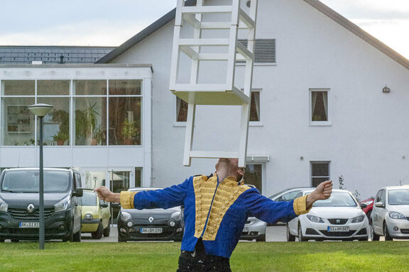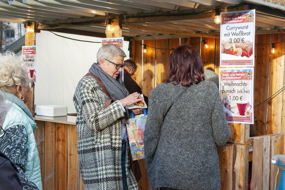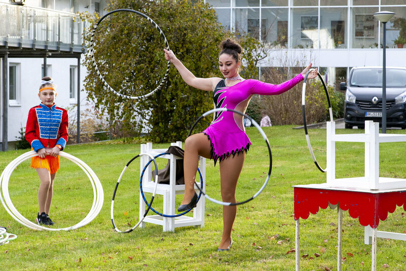 Für das leibliche Wohl gab es neben unterschiedlichsten Kuchen auch frisch gebackene Waffeln. Wem der Appetit mehr nach etwas Herzhaftem stand, konnte sich im Außenbereich mit Bratwurst oder Currywurst versorgen, dazu waren alkoholfreier Punsch und Glühwein im Angebot. Für fröhliche Klänge sorgte im Foyer des Festsaals Bernhard Grauer mit seiner Drehorgel. Draußen gab es nachmittags sogar Akrobatik und Jonglage zu bewundern, denn einige Artisten des unweit gastierenden Zirkus Trumpf hatten ein kleines Programm zusammengestellt.