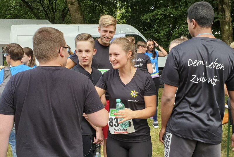 Nicht nur das Wetter und die gute Stimmung machten den Lauf zu einem angenehmen Erlebnis: Erstmals gab es in diesem Jahr für alle Teilnehmenden T-Shirts aus Funktionsstoff mit aufgedrucktem Friedenshort-Stern und -Schriftzug. So gut ausgestattet und dazu noch rege angefeuert von der Leitung der Region West, David Cziudaj, Andrea Krumm-Tzoulas und Udo Klöckner, sowie einigen weiteren Fans, ging es auf die Strecke.
