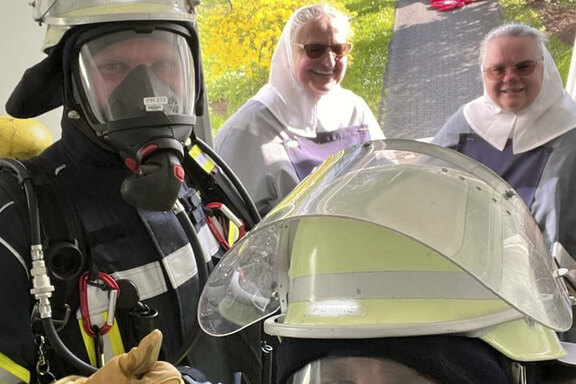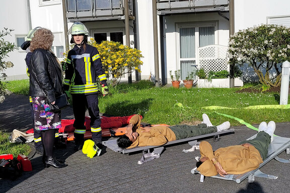 Glücklicherweise stellte sich für alle Beteiligten recht schnell heraus, dass es sich nicht um ein reales Feuer im Wohntrakt der dort lebenden Senioren und Diakonissen, sondern um eine gut und äußerst geheim vorbereitete Alarmübung handelte. Neben Dummies haben zwei Jugendliche aus der ION Freudenberg und der WG Flecken, die beide auf dem Gelände zu Hause sind, die „vermissten und zu retteten Personen" mit Begeisterung dargestellt. Auch für einige Schwestern war diese Einsatzübung eine zum Glück heitere Abwechslung, so dass sogar Selfies mit den Feuerwehrleuten erbeten wurden.