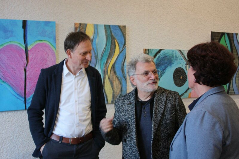 Zur Vernissage am 15. Januar begrüßte Ulrich Schimmel, erster Stellvertreter des Oberbürgermeisters, rund 60 Gäste und äußerte seine Freude über die Ausstellung im Rathaus. Auch der Vorsitzende des Fördervereins der Region Süd der Evangelischen Jugendhilfe Friedenshort, Günter Reustlen, würdigte die farbenfrohen und beeindruckenden Exponate. Theoretische Überlegungen führte Mentor Dr. Lothar Steeb in seiner Einführung in die Ausstellung an: „Kunst vermag das Dunkel, das Unergründliche und das Chaos zu materialisieren. Sie ist Ausdruck des Erlebten und der Welt.“ Mit Gesang und Gitarrenklängen sorgten Anerkennungspraktikant Daniel Mezger sowie Patrice Peter Gerlach, der zurzeit seinen Bundesfreiwilligendienst im Friedenshort absolviert, für das musikalische Rahmenprogramm.