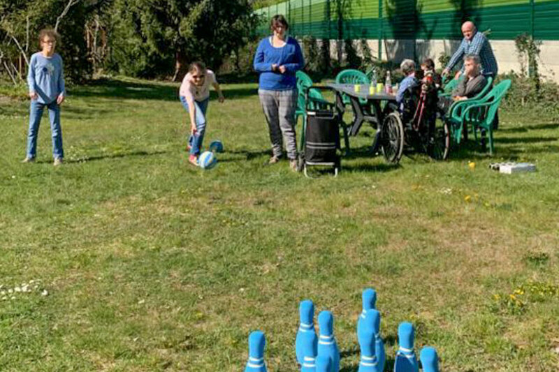 Und es gibt immer wieder schöne kreative Momente in der scheinbar unendlichen Gleichmäßigkeit Woche für Woche. Da ist die Freude über eine zufällige Begegnung, wenn einige Bewohnerinnen und Bewohner mit den Mitarbeitenden vom Spaziergang zurückkommen und den eigenen Weg kreuzen, oder darüber, wenn aus dem Fenster zum Abschied „Auf Wiedersehen“ oder „Hallo“ gerufen wird. In den Gruppen laufen zudem Aktivitäten, die mit Vergnügen angenommen werden. An den noch kälteren Tagen der Corona-Wochen ergriff eine der Gruppen in ihrem großen Wohnzimmer das Tischtennis-Fieber. Es wurden fast täglich Matches auf der aufgestellten Tischtennisplatte ausgetragen. An den wärmeren Tagen veranstaltete die Gruppe zudem ein Kegelturnier im Garten. Zwei ältere Damen im Haus lassen sich sehr gerne mit der Fahrradrikscha kutschieren, die eine der Damen sich von dem Geld aus dem Entschädigungsfonds leisten konnte. Andere passen ihr Hobby den Corona-Notwendigkeiten an: So hat Udo, ein 50-jähriger Bewohner, der gerne stundenlang Schals häkelt, für seinen Teddy eine Mund-Nasen-Maske gehäkelt.