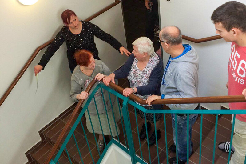 Der Höhepunkt der Woche ist für Mitarbeitende und die Bewohnerschaft das Treppenhaus-Singen in der Mozartstraße 21-22: wenn Norbert Forcher sein Keyboard aufbaut und Liederzettel in allen Etagen verteilt, die Trompete von Daniela Frick ertönt, die Bewohner/-innen aus den Wohnungen ans Treppengeländer ihrer Etage treten und gemeinsam das Friedenshortlied aus allen Etagen erklingt, wenn Frühlingslieder aus voller Kehle gesungen werden und sich alle Beteiligten mit dem Mozartstraßen-Andachtshit „Komm Herr, segne uns“ den Schlusssegen zurufen.