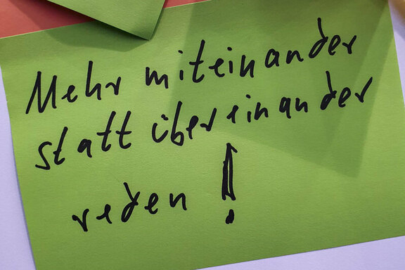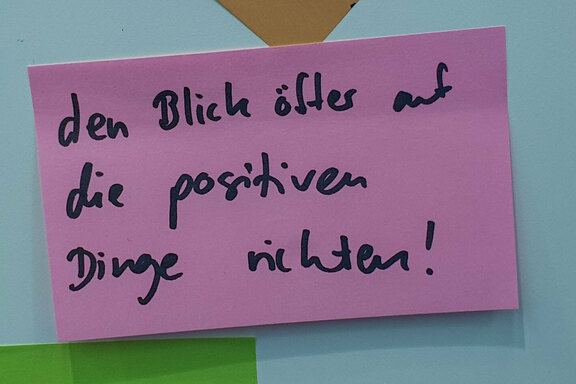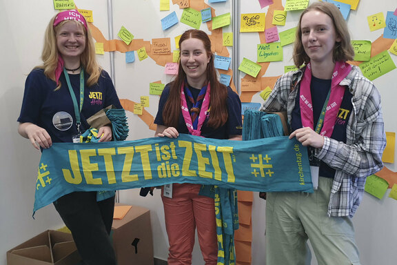 Die zweite Säule war eine Mitmach-Aktion. „Post it now“ lautete die Aufforderung, also „Teile es jetzt mit!“. Das „Posten“ ist allen mit Social Media Vertrauten sicherlich bekannt, denn dieser Anglizismus meint die kurzen Mitteilungen, die über die diversen Kanäle geschickt werden. Am Friedenshort-Stand bekam das „Posten“ einen doppelten Wortsinn. Denn hier ging es darum, diese Mitteilungen nicht digital, sondern haptisch zu verfassen, und zwar auf „Post-its“. Das ist der Markenname für die bekannten Klebe- oder Notizzettel, die der Friedenshort für die Mitmach-Aktion in unterschiedlichsten Farben und Größen bereithielt. Jeder Tag hatte eine andere Fragestellung, orientiert jeweils am Kirchentagsleitwort „Jetzt ist die Zeit!“. Die Klebezettel wurden dann durch die Gäste an einem Darstellungsbereich der Messestandwände angebracht und im Laufe des Tages füllte sich mehr und mehr ein buntes Bild mit „Posts“. Auch wenn diese Mitmach-Aktion haptisch ablief, gab es dennoch eine Verknüpfung mit Social Media. Denn wer wollte, konnte sich vor dieser Aktionswand fotografieren lassen, diese Fotos wanderten dann in die Instagram-Story und durch Erwähnung der Accountnamen der jeweiligen Verfasserinnen und Verfasser konnten diese wiederum diese Bilder in ihre eigenen Kanäle übernehmen. Rund 500 erreichte Accounts während des Kirchentages zeugen davon, dass es funktionierte.