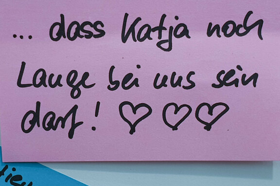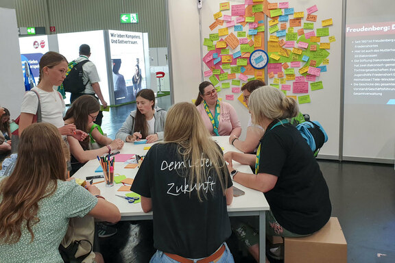 Haften blieben während des Kirchentages aber nicht nur diese Klebezettel, sondern besonders die Begegnungen am Stand. „Mich hat diese Offenheit sehr beeindruckt, die bei den Gesprächen gezeigt wurde“, betonte Pfrn. Ute Riegas-Chaikowski, Leitende Theologin im Friedenshort. Gleiches bestätigten auch alle Team-Mitglieder, die am Kreativtisch der „Post-it-Aktion“ nicht nur Hilfestellung gaben, sondern auch den teils regen Austausch bewunderten, der mit den Gästen über ihre jeweils persönlichen Gedanken möglich war. Viele Gäste hatten sogar eine Geschichte mit persönlichem Bezug zum Friedenshort im Gepäck: der Lehrer, der mit seiner Klasse im Religionsunterricht zu Diakonie-Persönlichkeiten Mutter Eva behandelt hat, die Dame, die vor rund 50 Jahren in der hauswirtschaftlichen Ausbildung im Friedenshort war und vom Einbrecher erzählte, der plötzlich im Zimmer stand, die ältere Dame, die begeistert vom Aufwachsen in einer Friedenshort-Einrichtung erzählte, die Menschen, die aus einer anderen diakonischen Einrichtung der Eingliederungshilfe am Stand waren und sich sehr freuten, beim Friedenshort Bekanntes aus der eigenen Lebenswelt zu entdecken u. v. m. Auch Prominenz konnte auf dem Messestand des Friedenshortes begrüßt werden, was natürlich mit Erinnerungsfotos festgehalten wurde. Dazu gehörten: Bischof Georg Bätzing, Vorsitzender der Bischofskonferenz der Katholischen Kirche in Deutschland, Anna Nicole Heinrich, Präses der Synode der EKD, Pfrn. Christa Schrauf, Geschäftsführerin des Kaiserswerther Verbandes, und Dr. Ekkehard Thiesler, Vorstandsvorsitzender der KD-Bank.