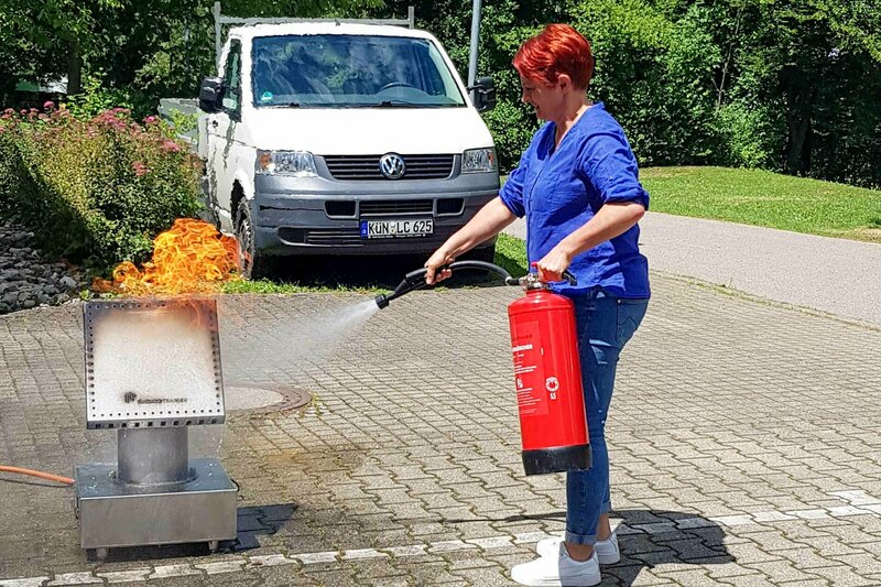 Nachdem der theoretische Teil abgeschlossen war, konnten die Teilnehmenden in einem Kurztest zeigen, ob sie während der Schulung gut aufgepasst hatten. Anschließend setzten sie das theoretisch erworbene Wissen in die Tat um – im Rahmen einer Übung wurde ein Brand gelöscht. Nach ca. 3,5 Stunden Schulung dürfen sich nun alle Teilnehmenden Brandschutzhelferin/-helfer nennen und können im Notfall ihr Fachwissen zur Anwendung bringen.