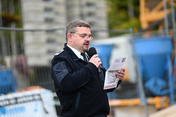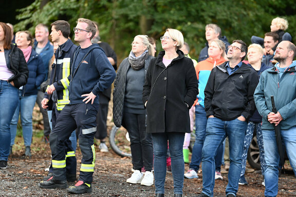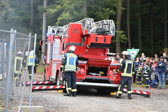 Mit vereinten Kräften gelingt es den Feuerwehrleuten aus Freudenberg, Plittershagen und Mausbach unter den Augen zahlreicher Zuschauer, darunter Bürgermeisterin Nicole Reschke, alle gestellten Aufgaben zu lösen. Spektakulär anzusehen waren dabei vor allem die Rettung via Drehleiter vom Baugerüst des Gebäudeteils C der zukünftigen Einrichtung und die Pyrotechnik-Effekte, für die der heimische Spezialist Thomas Fischer sorgte. Aus Sicht des Friedenshortes bleibt zu sagen: Danke für den zuverlässigen Einsatz!