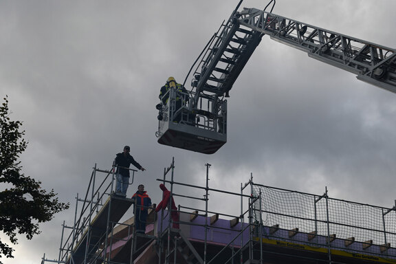 Das Szenario: Während der Bauarbeiten versäumt ein Handwerker, der Klempnerarbeiten ausführt, eine Gasflasche korrekt zu verschließen. Unbemerkt strömt Gas aus. Einem Dachdecker fällt ein Hammer aus der Hand, das aufschlagende Werkzeug sorgt für Funkenflug, das Gas verpufft mit einem lauten Knall und sorgt für eine Brandentwicklung. Die Klempner werden vermisst, einer der Dachdecker knickt aufgrund des Schreckmoments um und kann nicht mehr auftreten. Für die Feuerwehrkräfte gilt es, zwei Handwerker vom Gerüst zu bergen, zwei vermisste Personen im Gebäude zu finden und zu bergen sowie den Brand zu bekämpfen.