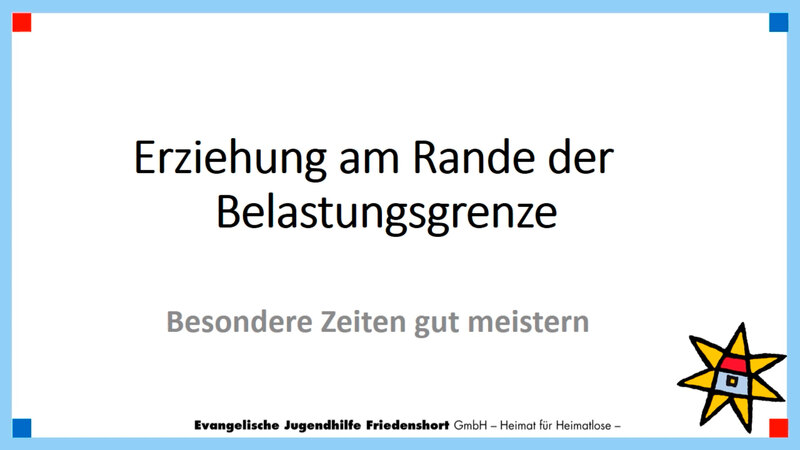 „Erziehung am Rande der Belastungsgrenze – besondere Zeiten gut meistern“ lautet der Titel des Videos. Dies trifft wohl derzeit auf viele Eltern zu. Bei Kindern, Jugendlichen und Eltern ist die „Luft raus“ und sie sind an ihre Grenzen gekommen. Familien sind auch unabhängig von den Corona-Einschränkungen oft mit anderen Themen belastet und beschäftigt. Den Beraterinnen ist es wichtig, die Eltern darin zu unterstützen, auf ihr eigenes Befinden zu schauen, milde mit sich selbst zu sein, um gelassener und positiver auf ihre Kinder reagieren zu können. Am Beispiel des „blutenden Knies“ erklärt Ariane Büttner, wie Eltern sensibler auf ihr weinendes Kind eingehen können. Eine sichtbare Wunde werde sofort verarztet und auch wenn „innere Verletzungen“ nicht sichtbar seien, so sollten sie doch ernst genommen und „verarztet“, also getröstet werden. Das Video enthält anschauliche Erklärungen sowie Beispiele anhand von selbst gedrehten kurzen Filmsequenzen. Am Ende sind die Eltern dazu eingeladen, mit einer kleinen Meditation Kraft zu tanken, um positiv gestimmt weitermachen zu können.