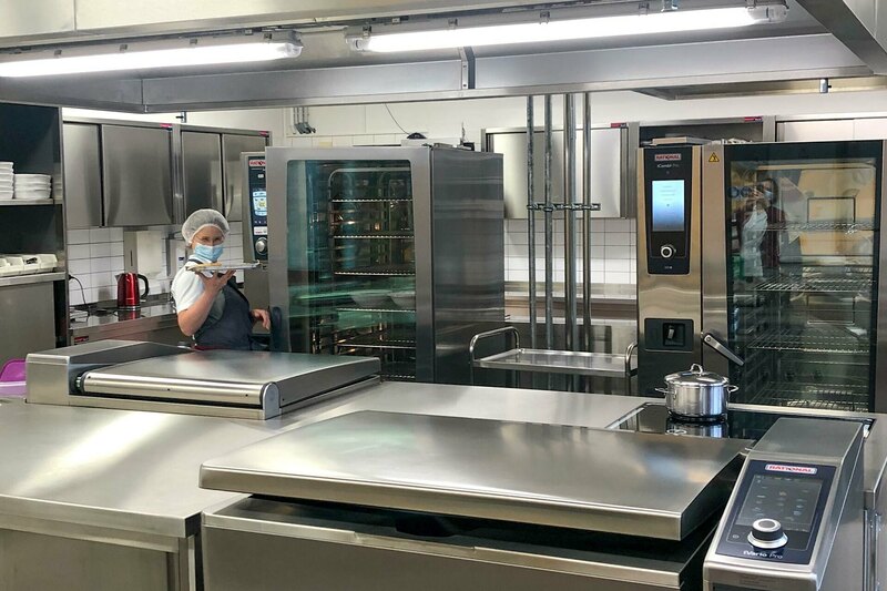 Nachdem im Frühjahr 2020 der gesamte Umbau erfreulicherweise für die Investplanung genehmigt wurde, ging es an die Umsetzung. Nach Messebesuchen, diversen Gesprächen mit potentiellen Lieferanten und einer Exkursion des Küchenteams zum Probekochen fiel die Entscheidung. Neben einem neuen Kochblock mit Ceranfeld und einer neuen Spülmaschine sollten drei Großgeräte der Fa. Rational angeschafft werden. Diese bieten nicht nur viele verschiedene Gartechniken in einem Gerät, sondern arbeiten auch ohne Wärmeverlust, wodurch die Garzeit stark verkürzt werden kann. Nach Abschluss der Planungs- und Angebotsphase ging im Frühjahr 2021 der Auftrag an die Firmen Holzwarth (Küche), Polytech (Decke) und Systair (Lüftungsanlage). Der Umbau sollte in den Sommerferien stattfinden.