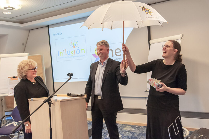 Aus der Praxis berichteten Andrea Krumm-Tzoulas und Björn Körner (Leitungsteam der Einrichtung Siegen-Wittgenstein/Märkischer Kreis) über die Kooperation mit der Universität Siegen sowie den gut besuchten Fachtag Inklusion im Frühjahr (wir berichteten bereits ausführlich in Heft 1-24). Die mit Studierenden entwickelten Bausteine zu inklusiven Konzepten waren zudem Grundlage für Fragen, die im Plenum in Kleingruppen behandelt wurden. Das Verzahnen von Praxis und Wissenschaft im Inklusionsprojekt mit der Uni Siegen hat aus Sicht der beiden Referenten noch eine Reihe positiver Nebeneffekte: Reputation als innovativer Träger und somit attraktiver Arbeitgeber, Erhöhen des Bekanntheitsgrades, Ausbau der Netzwerkarbeit und das Begleiten wissenschaftlicher Abschlussarbeiten mit intensivem Kontakt zu Absolventen.