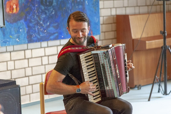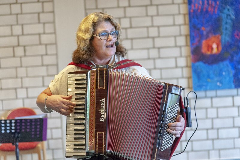 „Schneeweißchen & Rosenrot“, das Akkordeon- Schwesternduo Doris Krenzer und Ute Basar waren eingeladen, allerdings war „Schneeweißchen“ kurzfristig verhindert. Mehr als nur Ersatz hatte Ute Basar jedoch in Person von Emir Vildic mitgebracht. Der Dipl.-Musiker und Musiklehrer aus Bosnien-Herzegowina erwies sich als Meister melancholischer Weisen und auch klassischer Stücke, die zurecht begeisterten Applaus bekamen. Zuvor hatte Ute Basar in alpenländische Weisen und Volkslieder eingestimmt. Bei „Wenn wir erklimmen schwindelnde Höhen“ stimmten auch die überwiegend älteren Gäste klatschend oder summend mit ein.