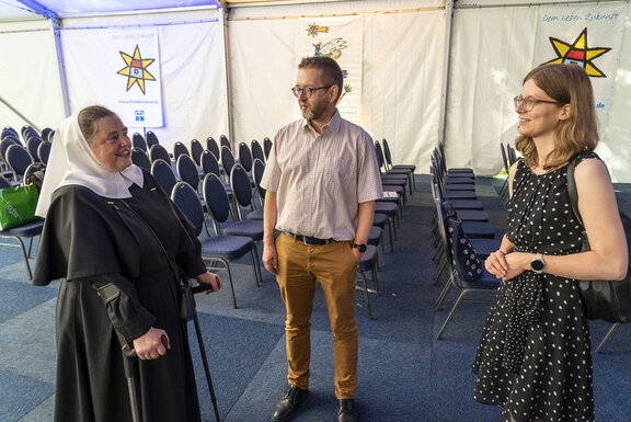 Freudenberg. Wenn es gelingt, in einer einzigen Veranstaltung Witzig-Fröhliches, Lyrisches, Musikalisches, Emotionales und Nachdenkliches miteinander zu verbinden, ohne dass man das Gefühl hat, es wäre etwas Unpassendes dabei, dann darf man wohl von einer sehr gelungenen Veranstaltung sprechen. So fiel jedenfalls der einhellige Tenor aus zur nachmittäglichen Feier im Kreis von Mitarbeitenden, Schwesternschaft und weiteren geladenen Gästen anlässlich der Verabschiedung von Sr. Christine Killies in den Ruhestand. Alle Regionen des Gesamtwerks, die Schwesternschaft, die Gesamtverwaltung sowie Familie und ehemalige Betreute haben zu diesem Gelingen gleichermaßen beigetragen. Mit dem berühmten „Roten Faden“ verband das Theater-Duo „Eure Formation“ (Lukas Ullrich + Till Florian Beyerbach) die unterschiedlichen Beiträge moderierend, während Wolf Codera und Andreas Recktenwald für die musikalischen Farbtupfer sorgten.
