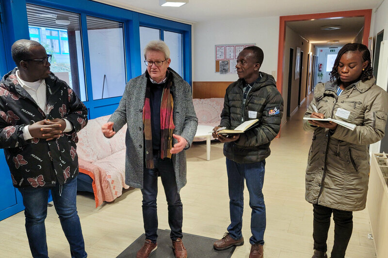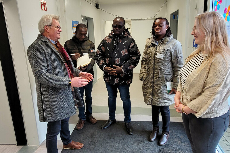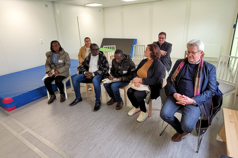 Am Dienstag war ein Teil der Delegation zu Gast im Friedenshort in Freudenberg. Andrea Krumm-Tzoulas und Torsten Stephany, beide als Einrichtungsleitung der Evangelischen Jugendhilfe Friedenshort im Bereich Siegen-Wittgenstein/Märkischer Kreis tätig, informierten dabei über das ausdifferenzierte Angebot an Hilfen zur Erziehung, welches unter anderem im Auftrag des Kreisjugendamtes vorgehalten wird. Besucht wurde dabei auch die Inobhutnahmestelle, die zur Krisenintervention Adhoc-Aufnahmen von Jugendlichen ermöglicht. „Das ist sicherlich eine Herausforderung, sich immer wieder auf Neuzugänge einzustellen“, übersetzte Erziehungswissenschaftler Prof. Johannes Schädler (Uni Siegen) eine Einschätzung der ghanaischen Gäste zur typischen, eher kurzen Verweildauer der jungen Menschen in einer Inobhutnahme. Zwar bejahte dies Gruppenleiterin Britta Köpper grundsätzlich, verdeutlichte jedoch auch die Freude, die es mache, jungen Menschen in einer akuten Krisensituation helfen zu können. Den Abschluss des Besuchs bildete eine Stippvisite in der Kita Friedensnest, die der Friedenshort im August 2022 neu eröffnet hat.