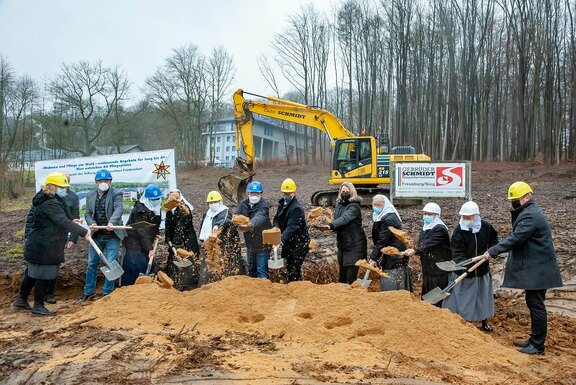 Mit dem Liedvers „Komm bau ein Haus, das uns beschützt“ begrüßte Leitende Theologin Pfrn. Ute Riegas-Chaikowski die Gäste. Verwirklicht werden soll ein Projekt, das den Menschen mehr biete als nur pflegerische Hilfe, das zu einem tatsächlichen Zuhause werde und dem diakonischen Anspruch gerecht werde, ein gutes Leben wahr werden zu lassen. „Uns hat dabei der Gedanke bewegt, wie wir eigentlich selbst gerne leben würden, wenn die Kräfte nachlassen und die Geburtstagskerzen immer zahlreicher werden“, betonte Pfrn. Riegas-Chaikowski. Anhand etlicher Lebenswünsche für das Alter verdeutlichte sie die Grundidee der Kombination aus Individualität und Gemeinschaft, aus Selbstbestimmtheit und Inanspruchnahme von Hilfe, die das pflegerische Konzept umfasst: „Lassen Sie uns gemeinsam daran arbeiten, dass hier ein Haus entsteht, in dem bis zum letzten Atemzug gelebt wird, umgeben von Wertschätzung und Respekt sowie der Liebe, die wir Gott nennen!“ Oberin Sr. Christine Killies hatte zur Begrüßung einen Vers aus Sprüche 24 mitgebracht: „Durch Weisheit wird ein Haus gebaut, durch Verstand wird es erhalten!“ Die neue Pflegeeinrichtung möge ein Haus werden, in dem sich Menschen geborgen fühlen und ihren Alltag als etwas Positives erfahren, so der Wunsch der Oberin. Gerade auch für ältere Menschen da zu sein, stehe in der Tradition von Friedenshort-Gründerin Mutter Eva, die sich von Anbeginn um Menschen jeden Alters gekümmert habe. Sr. Christine dankte allen, die sich mit viel Weisheit und Verstand in die Planungen eingebracht haben: „Der größte Dank gilt aber unserem Gott, weil wir immer wieder erfahren haben, dass ohne seinen Segen gar nichts geht.“