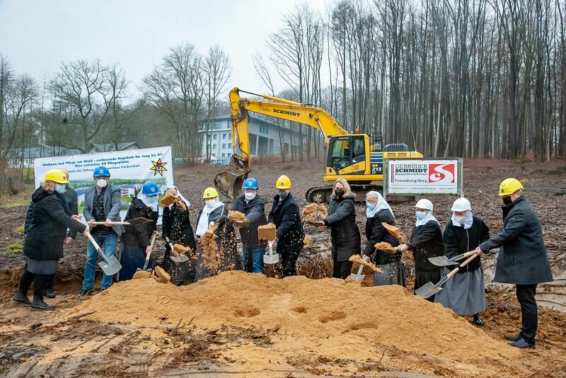 Freudenberg. Jetzt geht es los! Die Aufbruchsstimmung war am Montag, 17. Januar, bei allen Beteiligten deutlich zu spüren und verlieh dem „ersten Spatenstich“ den nötigen Schwung. Dieser traditionelle Auftakt zum Baubeginn galt dem großen Neubauprojekt „Wohnen und Pflege am Wald“ der Stiftung Diakonissenhaus Friedenshort. Wie bereits vor einiger Zeit berichtet, entsteht in unmittelbarer Angrenzung an bereits bestehende Friedenshort-Gebäude eine Pflege-Einrichtung mit insgesamt 80 Plätzen. In seiner Begrüßung der Gäste erinnerte Kaufmännischer Leiter Götz-Tilman Hadem noch einmal an die anfänglichen Gespräche vor rund zwei Jahren: „Die vielen Anfragen von Menschen nach Pflegeplätzen im Friedenshort, aber auch die sehr positive Resonanz seitens der Stadt Freudenberg und der Bürgermeisterin Frau Reschke haben uns für dieses Vorhaben sehr ermutigt.“ Sein Dank galt den vielen internen und externen Planungsbeteiligten, den ausführenden Firmen, der Bank für Kirche und Diakonie und vor allem dem Architekturbüro Halbach für die Bau- und Projektplanung. Besonders dankte Hadem den Friedenshort-Diakonissen für alles Mitdenken, das große Interesse und das Begleiten des Vorhabens im Gebet. Denn mit dem Dienst an Menschen, die in unterschiedlicher Form auf Hilfe angewiesen seien, führten die Schwestern den Grundgedanken der Friedenshort-Gründerin Eva von Tiele-Winckler fort, das eigene Leben der Nächstenliebe zu widmen. Die nun geplante Pflege-Einrichtung stelle eine gute Ergänzung der bisherigen Arbeitsfelder der Jugend- und Eingliederungshilfe dar, so Hadem. Mit einem Psalmwort verband er zudem den Wunsch, dass die Arbeiten in guter Weise und unfallfrei erfolgen mögen und auch der Geist spürbar werde, der bislang bereits prägend für den Friedenshort sei: „Glück auf unter Gottes Segen!“