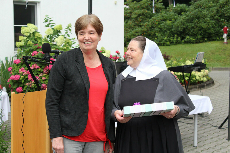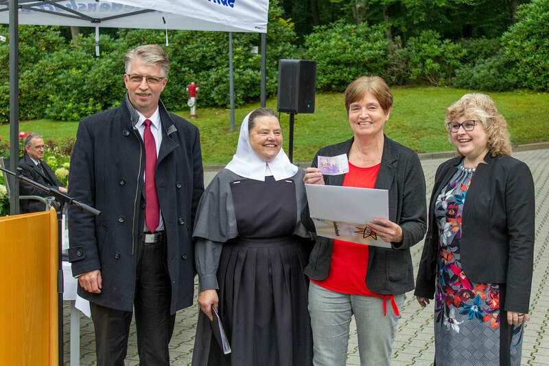 Freudenberg. Es ist eine Zahl, die fast nicht real erscheint: 46 Jahre! Dies ist die Anzahl an Dienstjahren von Brigitte Hamann in der Gesamtverwaltung des Friedenshortes in Freudenberg. Am 20. August ist sie als Vorstandssekretärin im Rahmen einer Morgenandacht in den Ruhestand verabschiedet worden, aus organisatorischen Gründen einige Tage vor dem tatsächlich letzten Arbeitstag 31.8.2021. Um unter Corona-Bedingungen den Mitarbeitenden, Schwestern und der Hausgemeinschaft eine bestmögliche Teilnahme zu gewähren, erfolgte der Abschied in Form einer Open-Air-Andacht vor dem Mutterhaus. Wer wollte, konnte aus den bundesweiten Einrichtungen des Friedenshortes per Videokonferenz im Internet live dabei sein. „Meine Zeit steht in deinen Händen“ – in der Andacht knüpfte Sr. Renate Kunert an dieses Lied und passende Verse aus dem Buch Kohelet an, in denen es darum geht, welche zueinander in Kontrast stehenden Dinge jeweils ihre Zeit haben: „Der Prediger akzeptiert die Brüchigkeit des Daseins und die Endlichkeit des Lebens und verdrängt dies nicht.“ Für viele Menschen sei heute das Leben vom Wunsch nach Absicherung in allen möglichen Bezügen geprägt, oft auch aus Angst. Aber Angst sei nicht das Leit-Thema der Bibel, sondern deren Überwindung in Person von Jesus Christus, vor allem mit Blick auf die Verheißung ewigen Lebens bei Gott: „Gottes Ewigkeit bietet uns eine Zuflucht, die der Strom der Vergänglichkeit nicht wegreißen kann.“
