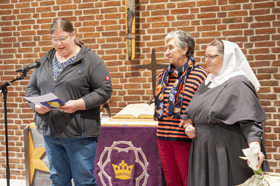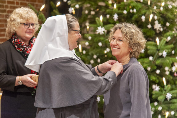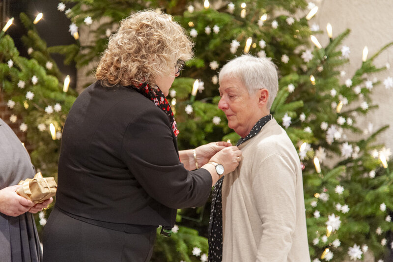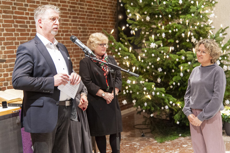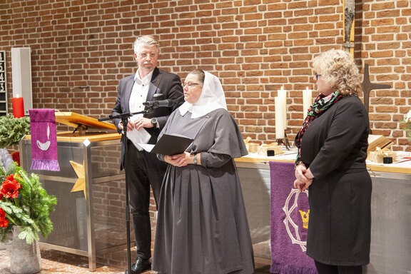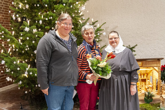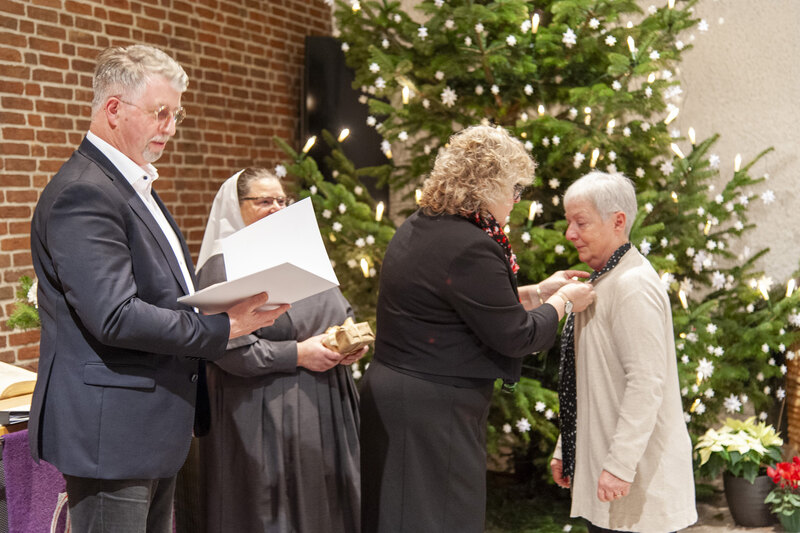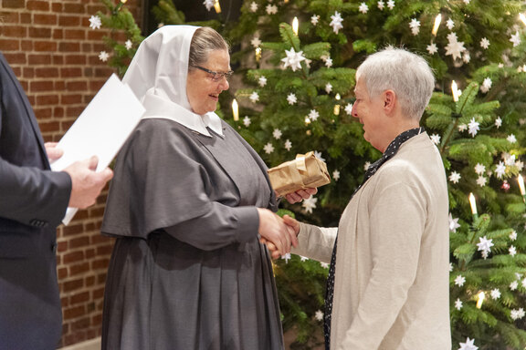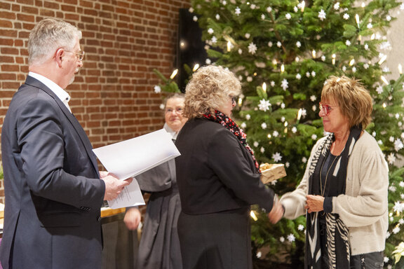 Die Weihnachtsfeier ist traditionell auch der Ort, langjährige Mitarbeitende zu ehren. So verliehen der Friedenshort-Vorstand mit Leitender Theologin Ute Riegas-Chaikowski und Kaufm. Leiter Götz-Tilman Hadem zusammen mit Oberin Sr. Christine Killies den Goldenen Friedenshortstern für 40-jährige Dienstzugehörigkeit an Birgit Wolf (Region West) und Martina Reinhard (Region Süd). Den silbernen Friedenshortstern für 25 Jahre erhielt Friederike Rembold-Fromm (Region Süd). Hauswirtschaftsleiterin Tabea Wirth verabschiedete zudem Frau Seel in den Ruhestand.