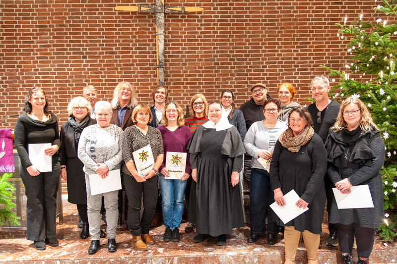 Seit dem Nachmittag war bereits die Gruppe der Jubilarinnen und Jubilare mit 25-jähriger Dienstzugehörigkeit bei der Geschäftsführung zu Gast und wurde bei einem Beisammensein im Konferenzraum der Gesamtverwaltung mit dem Silbernen Friedenshortstern ausgezeichnet. „Wir möchten Ihnen jetzt Ihre Jubiläumsurkunden aushändigen und Ihnen in dieser Weihnachtsfeier danken, für alles Engagement, ihre guten Gedanken und zuweilen auch notwendige Nervenstärke sowie ihre Lebenszeit, die Sie in den vergangenen 25 Jahren dem Friedenshort gewidmet haben“, betonte Leitende Theologin Pfrn. Ute Riegas-Chaikowski. Zusammen mit Kaufm. Leiter Götz-Tilman Hadem sowie Cordula Bächle-Walter (Regionalleitung Süd) und Oliver Klein (stellv. Regionalleiter West) nahm sie die Ehrungen vor. Die Jubilarinnen und Jubilare im Einzelnen (nicht alle konnten teilnehmen): Frank Uhling, Heike Krämer, Bettina Sallmann, Christian Guder, Dominik Feller, Gabriela Friedrich, Martina Kretschmer, Nicole Löchner, Sabine Roth-Leiser, Sabrina Benedikt, Sonja Heisterkamp, Stefanie Röcher, Susanne Hosenfeld, Tabea Nockemann.