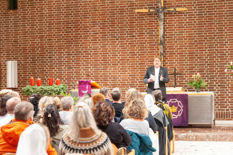 Freudenberg. Festliche Klänge, mutmachende Worte und die Würdigung von Dienstjubiläen für jeweils 25-jährige Zugehörigkeit zum Friedenshort standen im Zentrum der Weihnachtsfeier am 18. Dezember. Rund 140 Mitarbeitende, dazu Diakonissen und die auf dem Friedenshort-Gelände wohnende Hausgemeinschaft waren der Einladung in die Friedenshort-Kirche gefolgt. „Wie immer?!“ – Mit Ausrufe- oder Fragezeichen begrüßte Pfr. Christian Wagener (Referent für Seelsorge und Fortbildung im Friedenshort) die Gäste und gab Alltagsbeispiele zwischen Friseur und Bäckereitheke, die dafür typisch sind. „Der Monat Dezember hat dieses „Wie immer“ nahezu institutionalisiert, denn kaum ist die erste Kerze angezündet, läuft etwas ab wie ein Programm“, so Pfr. Wagener. Er sprach die Einladung aus zu einer „kollegialen Typberatung“: „Was für ein Weihnachtstyp bin ich eigentlich, was kommt bei mir alle Jahre wieder?“ Jedenfalls sei die Weihnachtsbotschaft ohne dieses „Alle Jahre wieder kommt das Christuskind“ ja nicht denkbar, denn Gott ist Mensch geworden! Aber diese Botschaft betone nicht ein „Weiter so“, sondern: Es muss nicht bleiben, wie es ist. Dazu ermuntere das Evangelium. Pfr. Wagener: „Wie immer? Ja, gerne, aber nur, wenn wir uns daran erinnern, dass es auch anders geht. Wir dürfen und wir können neu werden“