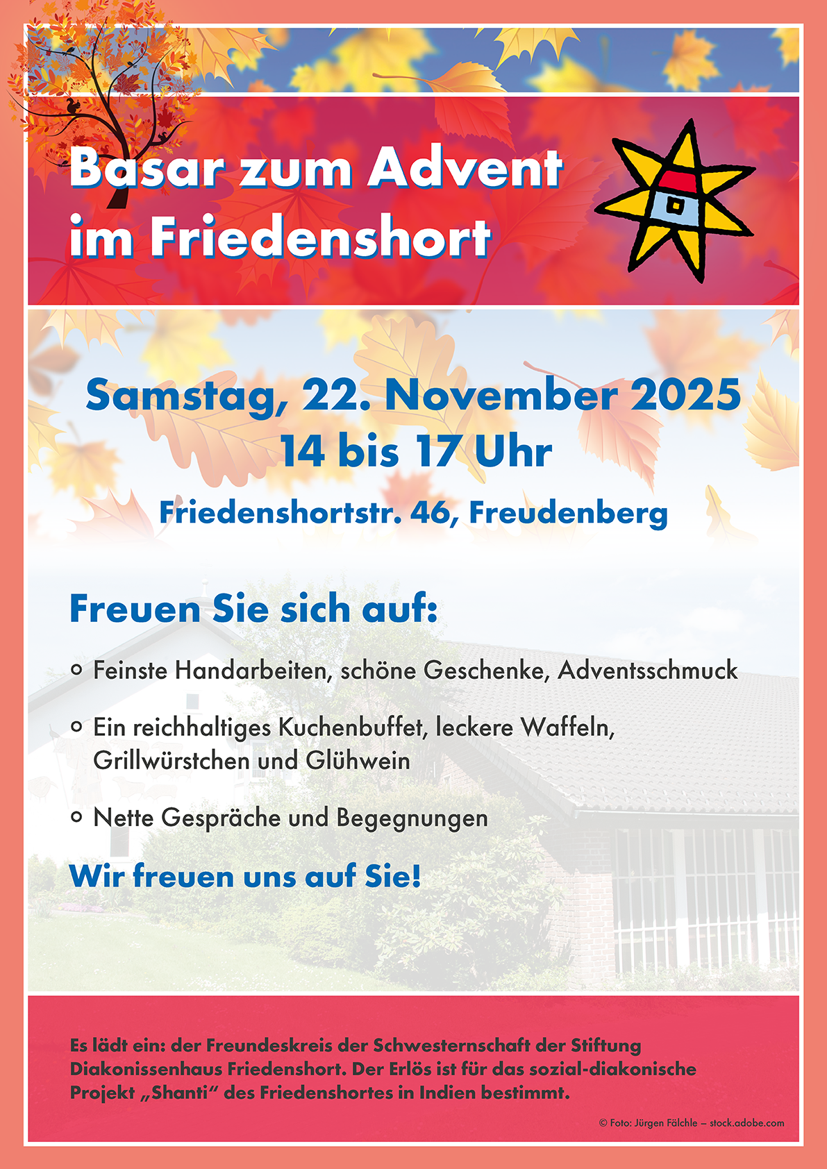 Freudenberg. Für viele hat er einen festen Platz im Terminkalender: Eine Woche vor dem ersten Advent, am Samstag, 22. November 2025, ist es wieder so weit: Der voradventliche Basar, vorbereitet von den Friedenshort-Diakonissen, Mitarbeitenden sowie dem Freundeskreis Friedenshort, hält von 14 bis 17 Uhr im Festsaal sowie im Mutterhaus seine gewohnt reichhaltige Auswahl schöner Geschenke, Handarbeiten und Weihnachtsschmuck bereit. Gleichzeitig besteht die Möglichkeit, sich im benachbarten Neubau „Wohnen und Pflege am Wald“ in einer Führung zu informieren. Das Leitungsteam der Anfang des Jahres eröffneten Pflegeeinrichtung steht von 14:30 Uhr bis 16:30 Uhr für Fragen zur Verfügung. Auf alle Gäste wartet im Speisesaal des Mutterhauses ein großes Kuchenbuffet. Außerdem werden frische Waffeln gebacken. Diejenigen, die eher Lust auf etwas Herzhaftes haben, können sich draußen mit einer leckeren Grill- oder Currywurst stärken. Zum Aufwärmen gibt es dort auch Punsch.