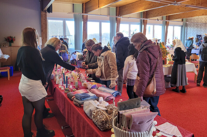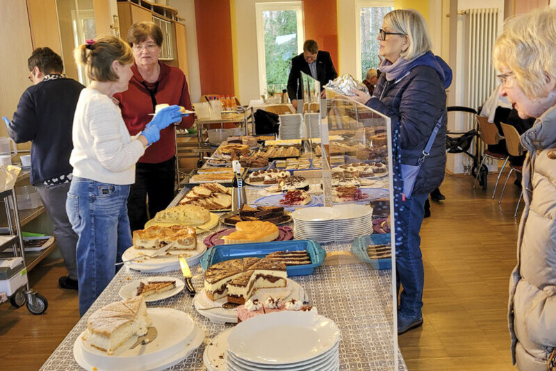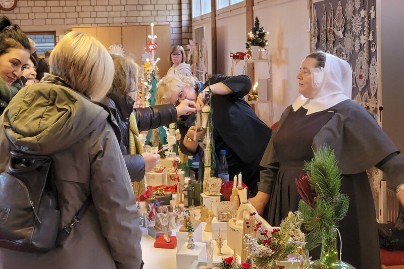 Freudenberg. Sonniges Winterwetter und sehr wahrscheinlich das gewohnt reichhaltige Angebot schöner Dinge lockte am vergangenen Samstag, 22. November, zahlreiche Gäste zum voradventlichen Basar in den Friedenshort. Weihnachtsschmuck unterschiedlichster Art und allerlei Gestricktes, Genähtes, Gebasteltes oder in schöne Formen Gegossenes waren im Angebot. Bei aller Unterschiedlichkeit der Dinge, gab es die große Gemeinsamkeit: in liebevoller Handarbeit gefertigt von Friedenshort-Diakonissen und deren Freundeskreisen sowie von Mitarbeitenden! Im Speisesaal wartete das bekannt große Kuchenbuffet und draußen war bei der Kälte der Stand mit Grillwurst und Punsch sehr willkommen, den die Kollegen des Technischen Dienstes unter ihren Fittichen hatten. Und Waffelduft zog ebenfalls durch die Räume der untersten Etage. "Wir sind sehr zufrieden mit der Resonanz", befand Oberin Sr. Christine Killies, die es sich nicht nehmen ließ, an ihrem Geburtstag beim Basar aktiv zu sein. Parallel bestand die Möglichkeit, sich im Anfang des Jahres eröffneten Neubau “Wohnen und Pflege am Wald” zu informieren.
