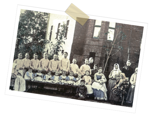 Eva von Tiele-Winckler (5.v.r.) mit den ersten jungen und alten Menschen, denen ihre Hilfe zuteil wurde. Fotografiert vor September 1892, da sie noch keine Tracht trägt.