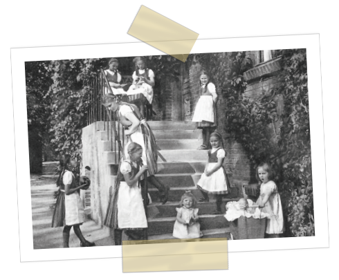 Kinder aus verschiedenen Gruppen vor dem Haus Zionsstille in Miechowitz. Mutter Eva gab allen Gruppen ihren (botanischen) Namen. Auf dem Foto zu erkennen sind die „Tautropfen“ (grün), „Schwalben“ (rot), „Mutters Freude“ (blau), „Rotkehlchen“ (orange).