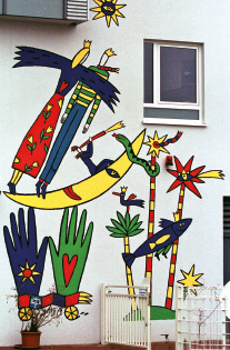 Von der Künstlerin Kitty Kahane gestaltete Fassade des Tiele-Winckler-Hauses in Berlin-Hellersdorf.