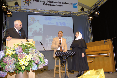Feierlichkeiten zum 50-jährigen Bestehen des Mutterhauses in Freudenberg, hier der Friedenshort-Vorstand mit Moderator Wolfgang Kroeber auf der Bühne