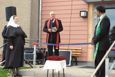Sr. Christine Killies, Pfr. Leonhard Gronbach und Bischof Jeevan R. Komanapalli bei der Eröffnung von „Haus Friede“ in Heiligengrabe, das zum Alten- und Pflegeheim modernisiert und umgebaut wurde. Auch Gästezimmer sind eingerichtet.
